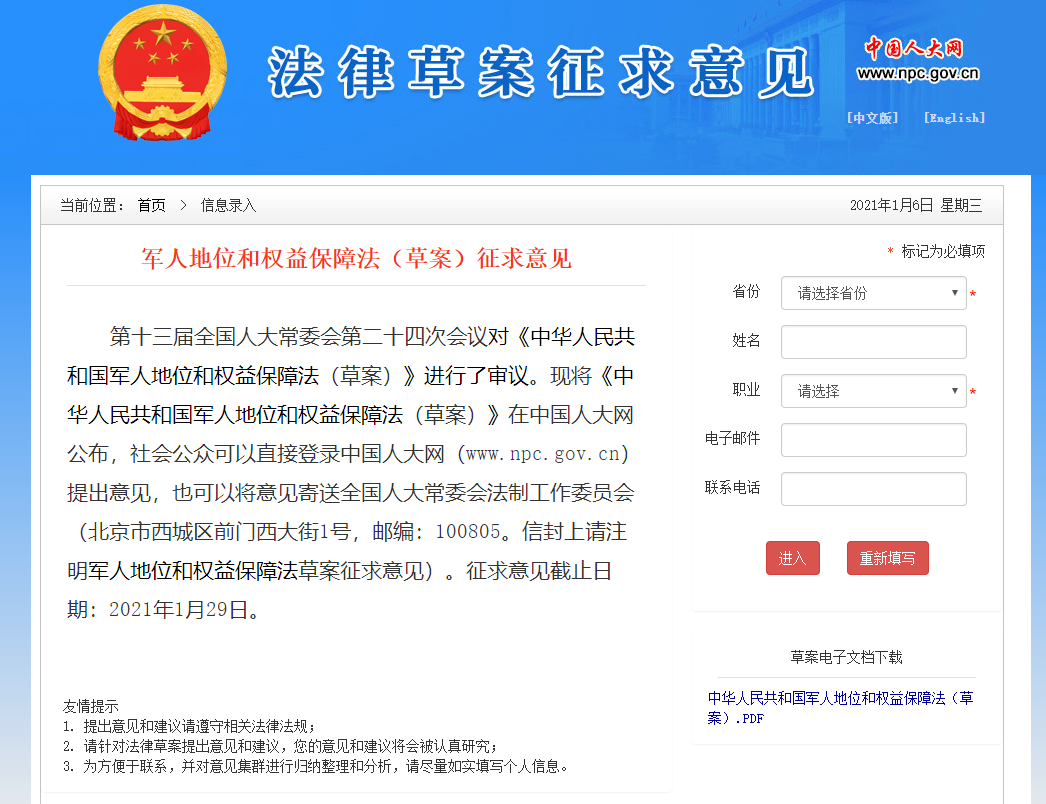 第十三届全国人大常委会第二十四次会议对《中华人民共和国军人地位和权益保障法(草案)》进行了审议。现将《中华人民共和国军人地位和权益保障法(草案)》在中国人大网公布,社会公众可以直接登录中国人大网(www.npc.gov.cn)提出意见,也可以将意见寄送全国人大常委会法制工作委员会(北京市西城区前门西大街1号,邮编:10085.信封上请注明军人地位和权益保障法草案征求意见)。征求意见截止日期:2021年1月29日。